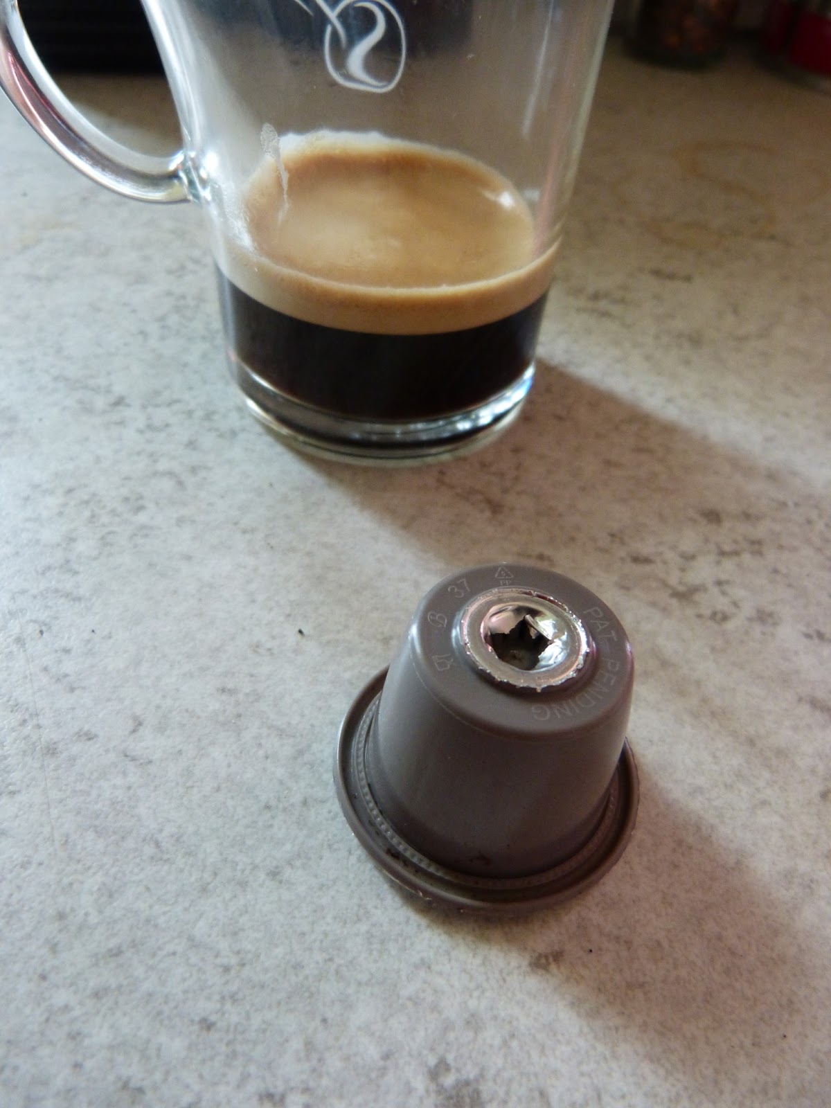 Das Herunterdrücken des Verschlusshebels funktioniert fast perfekt. Die Kapseln lassen sich wirklich fast so einfach wie die Original Nespresso Kapseln in die Maschine einlegen. Der Verschlusshebel schließt, wenn überhaupt, nur minimal schwerer. Der Kaffee fließt in der Regel sehr flüssig durch die Maschine. Nur selten tröpfelt der Kaffee langsam aus dem Kaffeeauslauf. Der Kapselauswurf funktioniert auch hier hervorragend. Die Kapseln landen, nach dem Öffnen des Verschlusshebels, zuverlässig im Sammelbehälter für die leeren Kapseln.