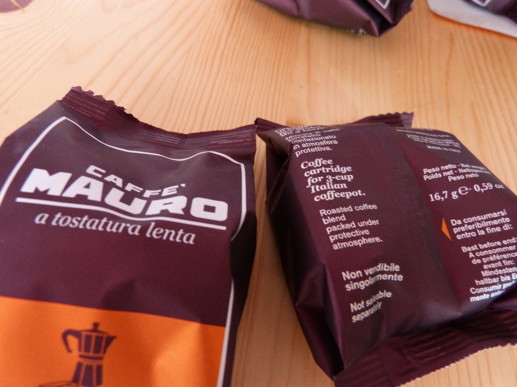 Die Mokaquick Kapseln selber sind noch einzeln in einer Plastikfolie eingeschweißt. Eine Kaffeekapsel enthält 16,7 Gramm Kaffee. Auf der Plastikfolie, die ebenfalls in dunkelbrauner Farbe gehalten ist, befindet sich der Aufdruck Caffé Mauro. Nach dem Öffnen der Plastikfolie strömt einem schon ein angenehmer Kaffeeduft entgegen. Dann kommt einem die riesige Kaffeekapsel entgegen. Die Mokaquick Kapsel besteht aus Kunststoff. Auf der Oberseite der Kapsel befindet sich ein weißes Filterpapier. Auf der Unterseite der Kapsel befinden sich viele kleine vorgestanzte Löcher. Direkt hinter den Löchern in der Kapsel befindet sich nochmals ein weißes Filterpapier. Die Kapsel selber ist transparent, so dass der Kaffee in der Kapsel gesehen werden kann. Gerade bei den Temperaturen, die bei der Kaffeezubereitung mit der Bialetti entstehen, habe ich mir aufgrund des Materials etwas Sorgen gemacht.