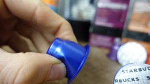 Die Kapsel der Starbucks Espresso-Kapseln ist, je nach Sorte, in unterschiedlichen Farben gehalten, so dass auch im nachhinein, ohne Verpackung, noch eine Unterscheidung möglich ist. Die Kapsel besteht aus Kunststoff und lässt sich zwischen den Fingern sehr einfach eindrücken. Durch das flexible Grundgehäuse dürfte es mit der Kompatibilität wenig Probleme geben. Auf der Ober- und Unterseite der Kapsel befindet sich ein Aluminium-Verschluss. Die Starbucks-Kapseln scheinen das Aroma tatsächlich auch in der Kapsel zu halten. Beim Öffnen der Verpackung konnte ich keinen Kaffeegeruch wahrnehmen. Die Kapsel hat eine glatte Kunststofffläche mit einer kleinen Kante im oberen Bereich. Auf dem Aluminiumverschluss steht in schwarzer Schrift „Starbucks“. Der Sortenname ist auf der Kapsel nicht mehr aufgedruckt.
